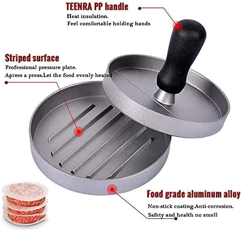 The non-stick surface makes patty release smooth and mess-free, while the sturdy alloy construction ensures durability and long-lasting use. Perfect for home kitchens, BBQ parties, restaurants, and outdoor grilling.