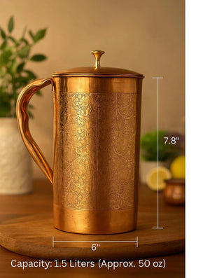 Bring tradition and wellness into your home with this Premium Pure Copper Jug, beautifully handcrafted with intricate designs and a polished finish. Perfect for storing and serving water, this jug is designed to combine health benefits, durability, and elegance in one.