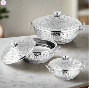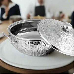 Bring royalty to your dining experience with the Shahi Hotpot, beautifully crafted from premium stainless steel and adorned with an intricate Naqsheen (engraved) design. This hotpot isn't just a serving dish – it's a statement piece for any kitchen or event.